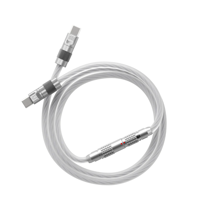 The X-Ray cable boasts an exclusive design, featuring translucent silicone cabling with white shielding and conductors. Its USB shells are CNC crafted from a custom copper alloy, with a matte silver PVD finish achieved through bead blasting. Additionally, the connectors offer a knurled grip and its slim silhouette ensures compatibility with various keyboards.